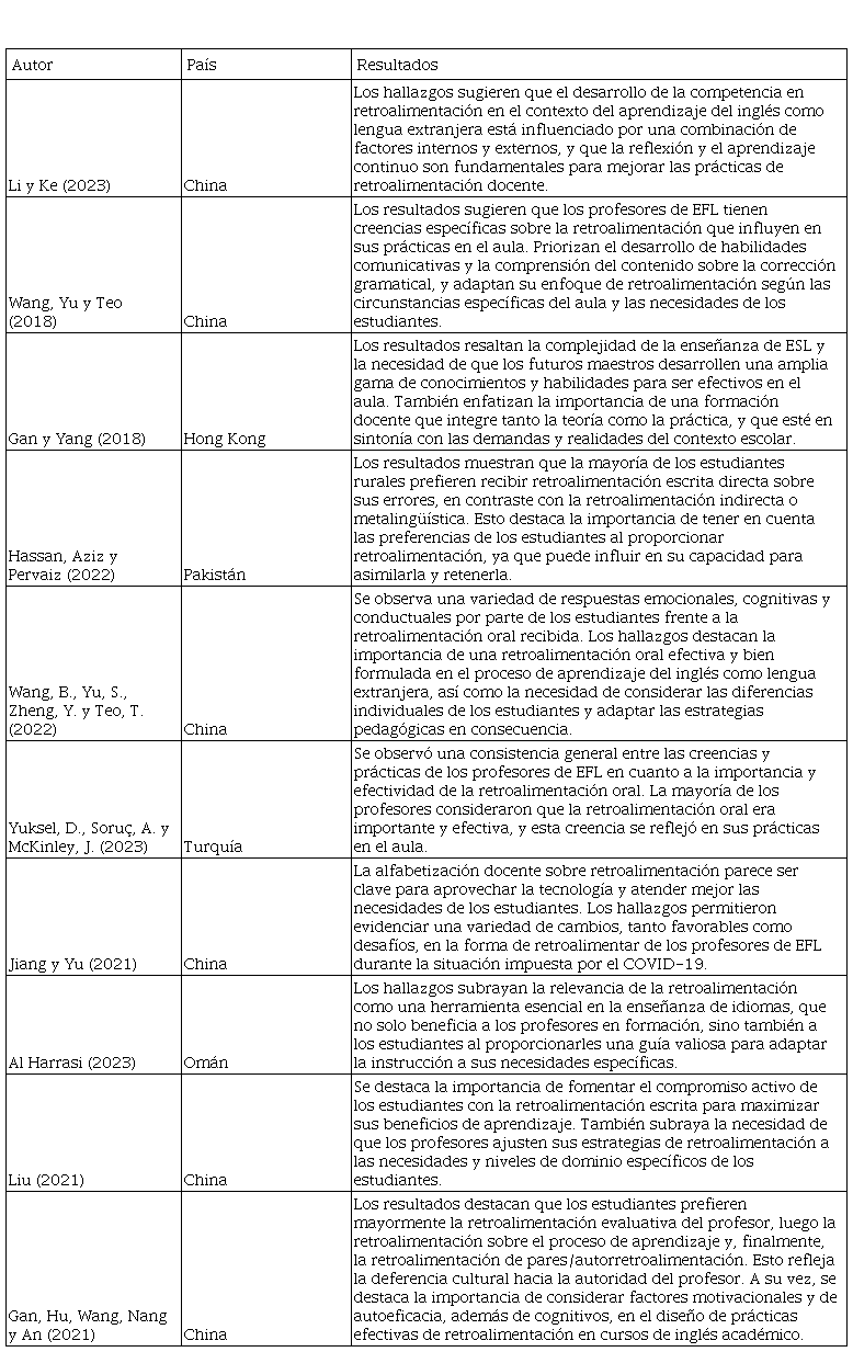 Finalmente, la información recopilada y analizada a través de la revisión sistémica realizada muestra que el continente asiático, especialmente China, está constantemente buscando mejorar la educación brindada a los estudiantes universitarios. Los docentes entienden la retroalimentación oportuna y eficaz como un pilar fundamental y necesario, un proceso activo y colaborativo y no solo como una manera de dar consejos a los estudiantes.