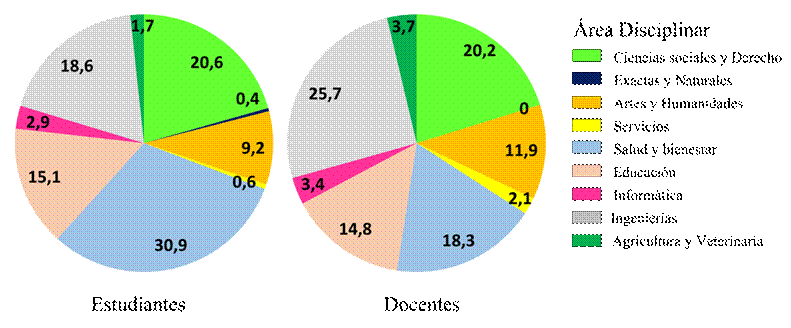 El colectivo estudiantil contó con 1185 personas (44,3 % hombres, 54,8 % mujeres, 0,5 % otros y 0,4 % prefiero no contestar), en su mayoría miembros del pregrado (92,8 %), y con una edad promedio de 23 años (23,4 ± 5,6 años). En cambio, el colectivo docente se conformó por 543 personas (59,3 % hombres y 40,7 % mujeres) adscritos principalmente al pregrado (85,9 %), con grado académico de maestría, en su mayoría (73,8 %), y con una media de experiencia docente de 13 años (12,9 ± 8,6 años). Ambos colectivos compartieron una composición variada y relativamente similar en relación con las áreas del conocimiento de sus participantes (Figura 2).