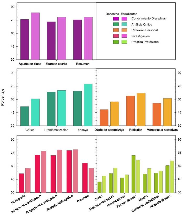 Los resultados conjuntos obtenidos de docentes y estudiantes apuntan que, en las aulas universitarias ecuatorianas, se escribe principalmente para demostrar el aprendizaje o comprensión de los conocimientos disciplinares, en detrimento de otros fines, como la reflexión personal o el análisis crítico. Esto queda demostrado a causa de la priorización de textos de la familia de conocimiento disciplinar (Figura 1). Dichas observaciones son congruentes con los resultados de trabajos previos (Álvarez y Yáñiz, 2015; Corcelles et al., 2015; De Castro y Niño, 2014; Pérez-Abril y Rodríguez, 2013).