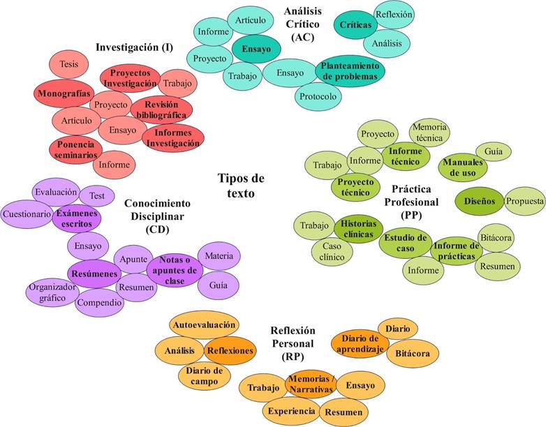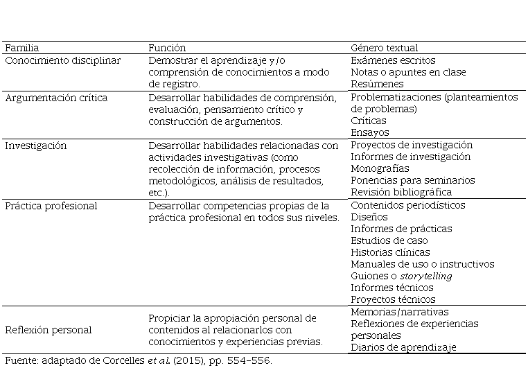 La amplia diversidad en las descripciones de los géneros y sus etiquetados evidencian cómo un mismo género textual puede ser empleado con fines que desvirtúan sus funciones primarias. Es común que, en este contexto, un género sea etiquetado de varias formas y, simultáneamente, una misma etiqueta se emplee para designar a diversos géneros. Por ejemplo, el género textual revisión bibliográfica se ha empleado con una finalidad distinta, propia de otro género textual, como el resumen o el ensayo. A lo antedicho, se añade un desconocimiento sobre las funciones de los textos, hecho que es en especial visible en el caso de la familia de reflexión personal(memorias/narrativas, reflexiones, diarios de aprendizaje), dadas las pobres e imprecisas descripciones recabadas, hecho relacionado a su escaso empleo y la predilección por otras familias textuales.