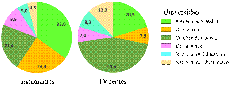 La muestra quedó constituida por 1732 sujetos (68,6 % estudiantes y 31,4 % docentes), provenientes de seis universidades ecuatorianas (Figura 1) y vinculados a distintas áreas del conocimiento (Figura 2).