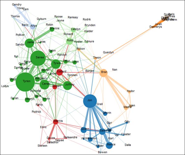 Como dijimos la Lectura Distante es una forma para pensar algorítmicamente sobre los textos. Una forma de analizar grandes volúmenes de datos en formato de texto mediante métodos computacionales que posibilitan, entre otras cosas, analizar tendencias y patrones, lo que permite hacerse preguntas y producir conocimiento asistidos por métodos computacionales de una manera complementaria a la que habilita la lectura tradicional (lectura cercana). En la Figura 1 se presenta el mapeo de personajes de la serie Game of Thrones, una obra que desearía por la complejidad de las genealogías familiares.