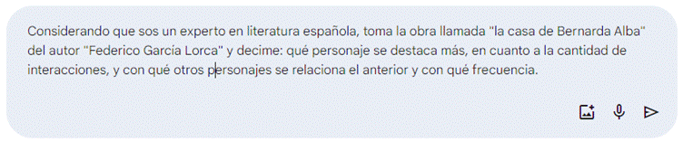 De la misma forma los modelos de lenguaje pueden ser usados para analizar relaciones entre personajes. En nuestra experimentación se eligió Gemini[9], la IA generativa de Google.[10] Para visualizar la información y posteriormente analizarla, en este caso es necesario escribir prompts para indicar sobre qué es lo que se quiere trabajar. Por ejemplo, es posible crear uno indicando: desde qué perspectiva se quiere analizar, qué obra literaria y pidiéndole que analice algo de lo que estamos trabajando que nos interese.