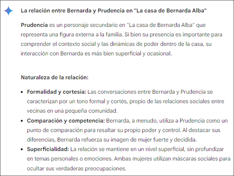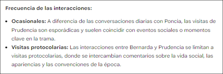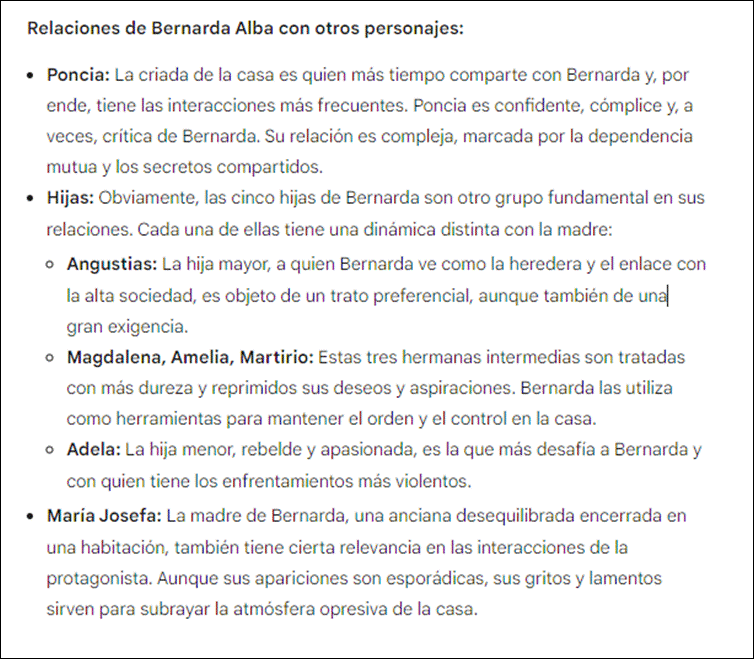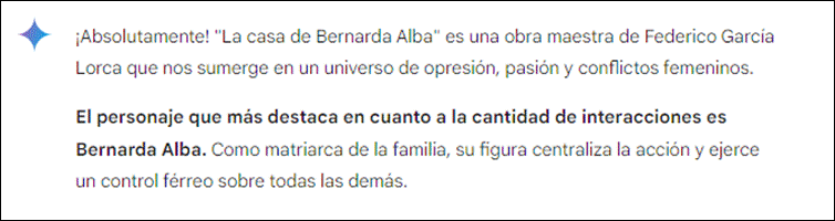 Al analizar el texto visualizado, en la primera parte de la respuesta (Figura 3) se indica que el personaje más destacado es Bernarda, lo que coincide con lo derivado en los dos análisis anteriores usando los otros dos recursos. Lo anterior, puede derivar en generar una nueva pregunta a la IA, para lo que se debe seguir indagando mediante prompts, lo que podría considerarse como una iteración hasta llegar a la decisión de terminar este proceso. Podríamos entonces, volver a usar una estrategia de prompt para solicitar más información, esta vez consultando lo que se visualiza en la Figura 5.
