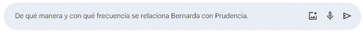 La Figura 5 muestra el prompt escrito con el siguiente texto: “De qué manera y con qué frecuencia se relaciona Bernarda con Prudencia”. Al ejecutar el prompt presentado en la Figura 5, la respuesta que se obtiene aparece en la Figura 5 (primera parte) y Figura 6 (segunda parte).