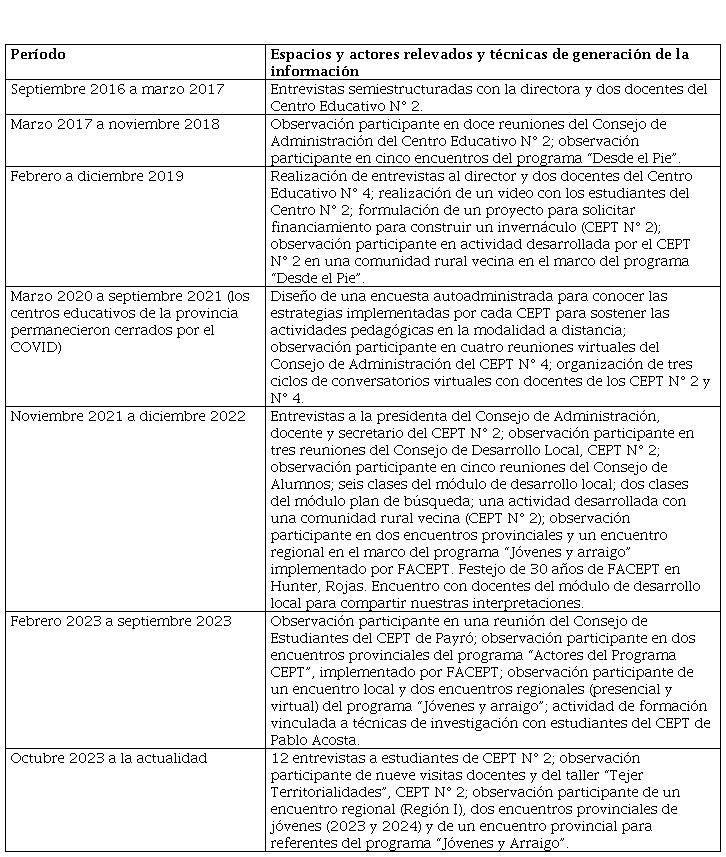 El trabajo de campo se inició en 2016, momento en el cual se estableció contacto con uno de los dos CEPT con los cuales estamos trabajando. En la siguiente tabla, se sistematizan las distintas etapas del trabajo de campo y las diversas instancias relevadas.