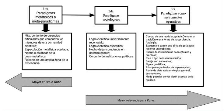 Obligado por la crítica debido a la ambigüedad con la cual manejó el concepto de paradigma, Kuhn intenta realizar una transición hacía un concepto que consideró de mayor precisión y el cual denominó matriz disciplinar. La matriz disciplinar busca incluir dos acepciones generales: la primera, que se refiere al conjunto de creencias que comparten los integrantes de la comunidad científica; y la segunda, que engloba a las distintas características que conforman la herencia, desarrollo y práctica de una disciplina científica (Picasso y de Gracia, 2021).