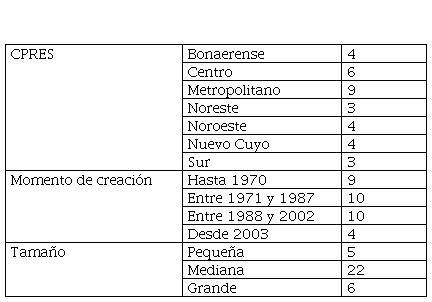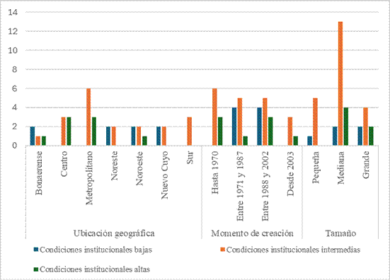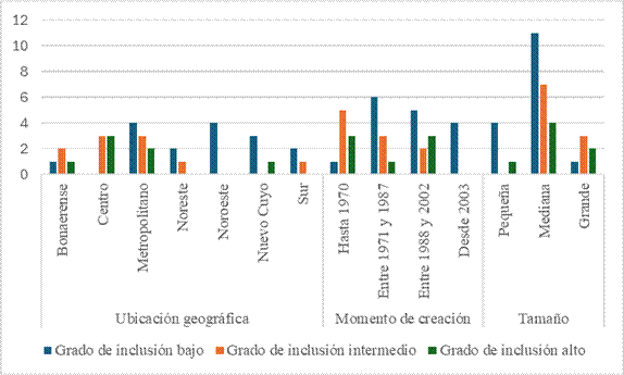 – Grados de inclusión institucional alto: se trata de un grupo minoritario de siete instituciones, que se distribuyen geográficamente de la siguiente manera: tres en la región centro, dos en el área metropolitana y una en el área bonaerense. Considerando el momento de creación, tres instituciones de este grupo fueron creadas antes de 1970, una institución entre 1971 y 1987 y las tres restantes, entre 1988 y 2002. No hay instituciones en este grupo que se hayan creado en el último período considerado. En relación con el tamaño, cuatro son medianas, dos grandes y una pequeña.
