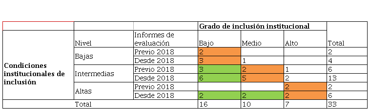 Por último, existe en este grupo un único caso en el que el informe es previo al año 2018, el cual ya mostraba condiciones institucionales bajas, pese a lo cual el grado de inclusión es alto. Entendemos que, aquí, podrían estar operando otras variables externas que no hemos analizado en este trabajo. Por ejemplo, las condiciones institucionales de inclusión podrían no ser necesarias para obtener buenos resultados de inclusión, debido a un perfil del estudiantado que no las necesita, ya sea por contar con apoyo familiar, condiciones socioeconómicas estables o una buena educación secundaria, entre otras.