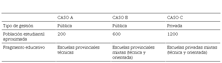 En dichos contextos, trabajamos con tres establecimientos educativos de nivel secundario. Dos de ellos son escuelas provinciales, de gestión estatal. El caso restante es una escuela privada a la que asisten jóvenes de sectores populares (Tabla 1).