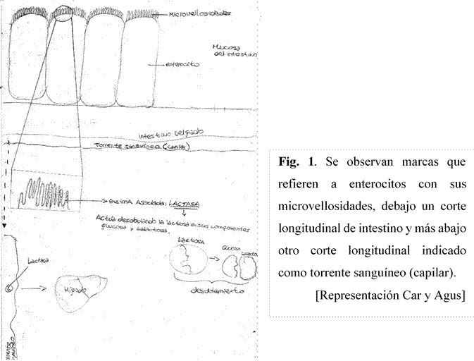 En los intercambios producidos con los autores de la representación que se observan en la Figura 1, podemos inferir cómo lo representado se interpone con la posibilidad de comprender lo funcional. La parte superior de esta refiere a un grupo de enterocitos y, por debajo de ellos, otras marcas señalan un corte longitudinal de intestino; inmediatamente después, otras se etiquetan como “capilar que recorre vellosidades”. Por debajo, una ampliación de las microvellosidades permite observar marcas que refieren al lugar donde se encuentra la lactasa.