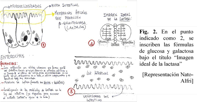 Más allá de la inscripción de una molécula creyendo que se trataba de otra, se puede estimar que Nato y su compañero Alfri se encuentran al igual que otras y otros estudiantes, transitando una instancia donde hay ideas más estables que otras. En el sector 1 de la representación, indican que la lactasa es producida por las membranas apicales de los enterocitos, mientras que, en el sector 3, evidencian que la enzima funciona en la luz intestinal. Recién cuando en el grupo clase se revisa lo inscripto, Nato percibe que la etiqueta “lactasa” debería decir lactosa, es decir que, si bien se repara en la diferencia química entre la enzima y el disacárido, aún resta identificar que la enzima actúa adherida a la membrana de los enterocitos y no en la luz intestinal como representaron. El intercambio de ideas producido genera que todos los y las estudiantes del curso y no solo Nato comiencen a repensar las ideas volcadas al papel, poniendo en valor la situación de representar como herramienta que permite, a partir de lo plasmado, precisar lo conceptual.