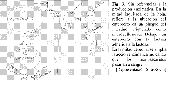 En este diálogo, Eve, una estudiante ajena a la representación, completa lo preguntado por la docente: “la lactasa desdobla a la lactosa degradándose en dos monosacáridos”. La docente vuelve a intervenir preguntando si alguna marca refiere a la producción de la lactasa, Luchi lo niega, agregando: “creo que en los enterocitos se desarrollaría la lactasa”. El diálogo relatado no permitió dar cuenta de si las ideas de las estudiantes respecto al accionar enzimático sufrieron modificaciones entre el momento de representar y este intercambio, dado que otra estudiante respondió por las autoras de la representación. Sin embargo, cuando Luchi expresa que supone una vinculación entre enterocitos y lactasa, es posible inferir que la propuesta de trabajar con otro sistema de representación, como es la oralidad, contribuye a que las alumnas puedan continuar ampliando los conceptos propuestos en la enseñanza.