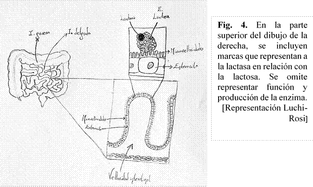 La representación de la Figura 4 es propuesta para su interpretación en clase por parte de la docente, dado que es la única que carece totalmente de referencias sobre el accionar de la enzima. Tampoco cuenta con ideas sobre su producción, pero, como esa ausencia se ve reflejada en otras representaciones, sólo la primera es la que atrae su atención en este momento. Las estudiantes representaron distintos niveles de organización, comenzando por el intestino delgado, sus vellosidades, sus células, hasta llegar a la molécula lactasa en su lugar de acción.