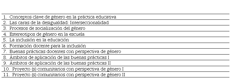 El diplomado Prácticas educativas para fomentar la igualdad de derechos y oportunidades entre hombres y mujeres formó parte de la oferta extracurricular de cursos de formación continua de 2023, dirigido al personal educativo de nivel básico en el estado de Colima, México. Con una duración de 120 horas, el diplomado se llevó a cabo entre el 5 de octubre y el 9 de diciembre a través de sesiones presenciales semanales y virtuales, impartiéndose simultáneamente en diversos municipios de la entidad. A continuación, se presentan los contenidos principales abordados en el diplomado: