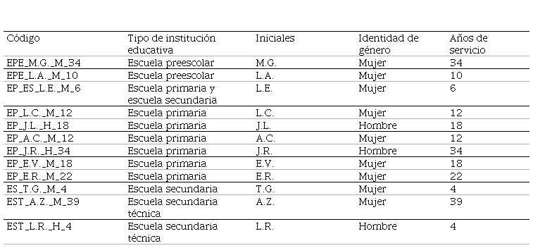 Con el objetivo de proteger la confidencialidad y el anonimato de las personas participantes, se generaron códigos con los cuales se identificaron las entrevistas. El código se generó considerando: tipo de institución educativa, iniciales, identidad de género y años de servicio. Los códigos generados a partir de esa información quedaron de la siguiente manera: "EP_N.L._M_20", significando EP: escuela primaria; iniciales: N.L.; género: mujer, años de servicio como docente: 20. En la Tabla 2, se encuentran los códigos generados para cada entrevista y sus significados.