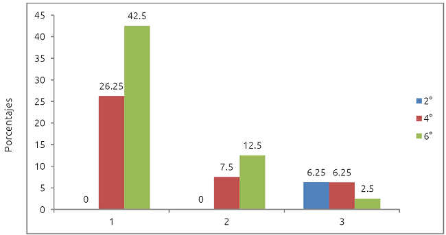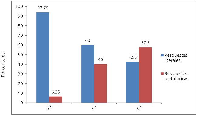 Como se aprecia en la figura 1, los niños mejoran en la comprensión de metáforas conforme se encuentran en grados más avanzados. Así, mientras los de 2o. grado de primaria alcanzan un porcentaje pequeño de respuestas que involucran el salto metafórico, los de 4o. prácticamente logran un 40%. En el caso de los niños de 6o. de primaria, casi dos de cada tres de sus respuestas involucran el cambio de dominio cognoscitivo y, por ende, respuestas de tipo metafórico. En ese sentido, los resultados obtenidos apuntan en la misma dirección que lo encontrado por Calderón (2012): se observa un patrón evolutivo ascendente en la comprensión de las metáforas íntimamente relacionado al nivel escolar.