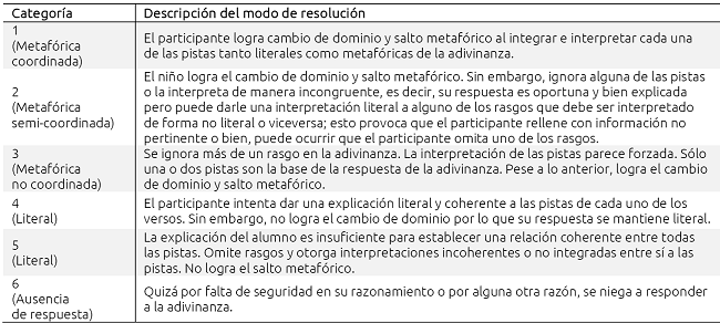La clasificación de respuestas estaba también centrada en el tipo de relaciones parte-todo que los participantes eran capaces de establecer a partir de la información contenida en las adivinanzas. La teoría psicogenética ha apuntado que el proceso de construcción de conocimiento implica una descentración cada vez mayor por parte del sujeto y esto no es otra cosa que lograr considerar de forma simultánea y coherente todas las propiedades, características y variables que constituyen dicho objeto (Ferreiro, 1999; Labinowicz, 1998). En este sentido, interesaba saber si los niños estudiados podían tomar en cuenta algunas, o todas las pistas que proporcionaba la adivinanza para dar una respuesta que implicara hacer un “salto metafórico“ y si las respuestas de tipo metafórico estaban relacionadas con el grado escolar de los participantes.