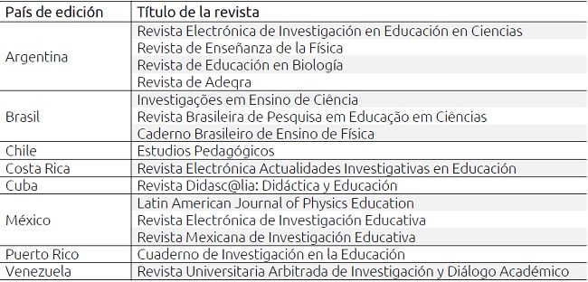 3) Todos los países de Latinoamérica y el Caribe que editan este tipo de revistas deben estar representados con al menos una publicación. En el caso de países que contaran con más de una revista relacionada con la Investigación Educativa (como es el caso de Argentina y Brasil) se eligen todas las especializadas en la didáctica de las Ciencias Experimentales (o disciplinas que las constituyen).