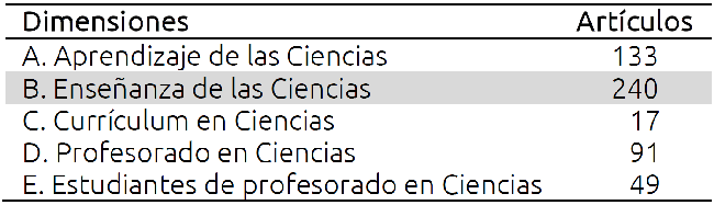En Enseñanza de las Ciencias se incluyen artículos que evalúan el impacto de recursos o metodologías didácticas que consideradas innovadoras e intentan superar una determinada problemática, o por ser un recurso didáctico que no ha sido implementado previamente como tal, o que su impacto no ha sido medido mediante un trabajo de investigación. Así, la subdimensión Estrategias o recursos didácticos contiene artículos que evalúan el impacto sobre la enseñanza o el aprendizaje de recursos didácticos o estrategias didácticas, mientras que la Propuesta de enseñanza abarca trabajos que analizan el impacto de una metodología de enseñanza diseñada e implementada en la investigación.