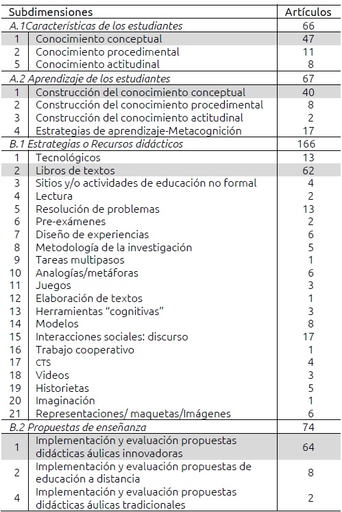 En segundo término, y con frecuencias mucho menores, se encuentran los trabajos que abordan el saber procedimental de los alumnos (relacionado principalmente con la forma en que elaboran argumentaciones) y aspectos intrínsecos al proceso de aprendizaje (estrategias de aprendizaje implementadas y habilidades de metacognición desarrolladas). El resto de las subdimensiones están representadas con un número muy reducido de trabajos.