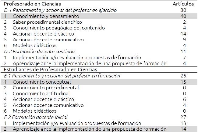 Dentro de la dimensión Profesorado en Ciencias se definen las subunidades Conocimiento y accionar del profesor en ejercicio y Formación docente continua. La primera engloba trabajos que estudian las concepciones del profesor sobre alguna temática científica; su conocimiento pedagógico de ciertos contenidos; sus opiniones sobre alguna variable que caracterizan los procesos de enseñanza y aprendizaje; su accionar (y con ello las estrategias que pone en juego en el aula; el discurso que implementa al interaccionar con los alumnos; los modelos didácticos subyacentes), mientras que la segunda subunidad reúne trabajos que dan cuenta del impacto de distintas capacitaciones docentes implementadas sobre el aprendizaje científico-didáctico propiciado en los docentes.