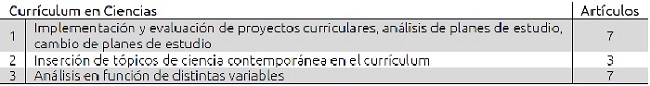 En la dimensión Currículum en Ciencias se incluyen artículos que analizan diseños curriculares o evalúan el impacto de innovaciones curriculares.