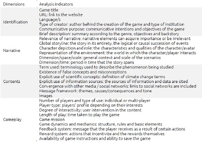 In order to obtain information on online climate change games in a systematic manner, a data collection checklist was drawn up. First, analysis indicators were identified through a bibliographic review (European SchoolNet, 2009; Grifeau, 2012; Katsaliaki, 2014; Lacasa 2011; Meira-Cartea, 2007; Moser, 2011; Pérez-Latorre, 2010; Piñuel-Raigada., 2013; Reckien and Eisenack, 2013; Werbach, 2012). These analysis indicators were divided into four dimensions: identification (features that help identify and locate the game); narrative (analysis of the narrative and expository structures); content (analysis of the content and messages transmitted about climate change); and gameplay (analysis of the game design and how this creates meaning).