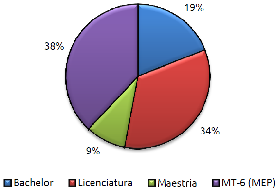 Only 9% of teachers had a master’s degree and 34% of the participants had a Licenciatura. On the other hand, 38% of the participants had an MT6 certification,4 the highest academic category for the MEP. This means that only 19% of teachers had just a B.A. degree. In this respect, results show that most teachers have high academic backgrounds in the field of EFL teaching. These results are consistent with the TOEIC qualification they have received as they are identified in the B1, B2 and C1 bands.