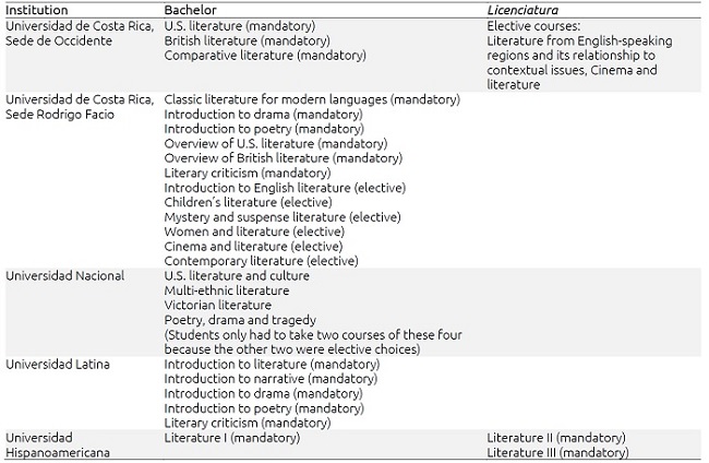 In the case of UCR, Campus Carlos Monge Alfaro, the bachelor program is made up of three mandatory courses related to U.S., British and Comparative literatures. This means that most teachers (59%) have taken these courses, as presented in table III.