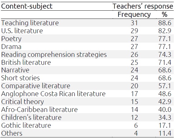 Figure 2 confirms the results of the analysis of university programs. Literature is not a priority in undergraduate and postgraduate academic curricula. According to the English advisor of the Western Educational Region, “teachers from this region have expressed concerns regarding the implementation process of this proposal [the MEP’s English literature program] because the courses teachers took at university did not include how to teach literature; they do not even know how to choose appropriate literary materials. They do not know how to assess students’ performance” (Artavia, personal communication, June 10, 2013). The courses teachers stated they took at the university are the following: