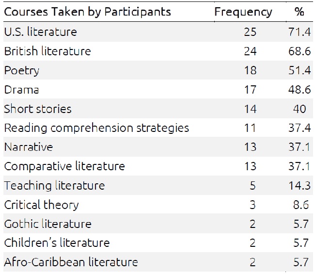 Another significant result is related to academic majors. It is important to highlight that 3% of the teachers majored in linguistics while 97% majored in teaching English as their primary B.A. major. Based on the information obtained through the survey and by analyzing the universities’ academic programs, there are no professors majoring in teaching literature as there are no universities that offer this program in Costa Rica, even though some universities offer degrees in literature, as is the case of the master’s degree program in English literature from the Universidad de Costa Rica, their focus is not on teaching literature. In addition, teachers have not had the opportunity to study abroad in countries where teaching literature is a common major in arts and science faculties. This represents an issue for EFL teachers, for Costa Rican universities and for the whole educational process proposed for EBHS because EFL teachers are taking on a professional challenge they have not been academically trained for. In this respect, the group of instructors, as a whole, reports that they have not taken any other literature courses besides the ones shown in table I.