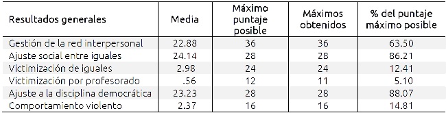 La estadística descriptiva de los cuestionarios (ver Tabla 1) arroja un comportamiento positivo general en las diferentes dimensiones de la convivencia escolar. En casi todos los casos el puntaje promedio es significativamente superior a la media de esa dimensión, lo que significaría que los alumnos colaboran entre ellos para resolver sus conflictos (ajuste social entre iguales), con 24.14 de 28 posibles; que están familiarizados y respetan las normas básicas de convivencia en la escuela (ajuste a la disciplina democrática), con 23.23 de 28 posibles; que sus actos de bullying son infrecuentes (comportamiento violento), con sólo 2.37 sobre 16 puntos máximos de violencia; y que los profesores no contribuyen a generar un ambiente de convivencia negativo con los alumnos (victimización por el profesorado), 0.562 sobre 12. La dimensión en la que la media se aleja significativamente del extremo deseable es la gestión de la red interpersonal, relacionada con la participación de padres de familia y docentes.