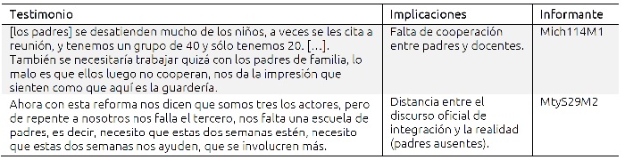 Gestión de la red interpersonal. Son recurrentes los testimonios de docentes que denuncian que no cuentan con el suficiente apoyo por parte de los padres, a quienes responsabilizan en gran medida del origen de los problemas de convivencia que se dan en la escuela (la Tabla II se ofrecen dos testimonios).