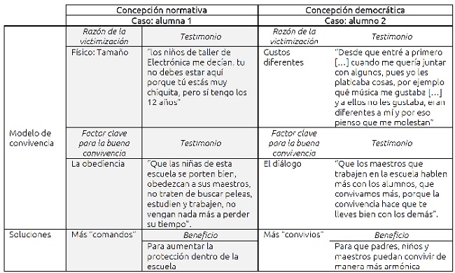 La Tabla III expone la experiencia de dos alumnos de la misma escuela (víctimas de exclusión) que interpretan su experiencia de forma muy diferente: mientras la alumna 1 parte de una concepción normativa de la moral y pide más protección y control, el alumno 2 parte de una visión más democrática y desea un mayor diálogo y oportunidades para la convivencia.