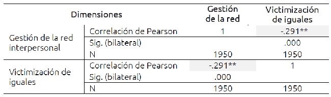 El instrumento ofrece la posibilidad de reconocer correlaciones especialmente significativas entre las dimensiones de la violencia escolar. La aplicación de correlaciones de Pearson entre variables arroja una fuerte correlación de carácter negativo entre la gestión de la red interpersonal y la victimización de iguales, es decir, entre la falta de implicación de los padres de familia en la escuela y la manifestación de la violencia entre los alumnos dentro de ella (ver Tabla IV).
