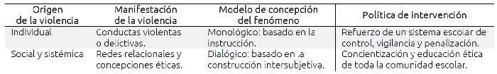 La Tabla V contrasta dos concepciones de la violencia asociadas a dos modelos de intervención. Las entrevistas documentan en los participantes (directivos, docentes y, alumnos) el predominio de la concepción individual y conductual de la violencia escolar y, por tanto, la aceptación implícita de un modelo de intervención monológico basado en el control, al cual de hecho responde el modelo del programa es. Sin embargo, esas políticas, a pesar del beneficio de inhibir la manifestación de la violencia dentro de la escuela, no generan la construcción a largo plazo de un ambiente escolar de convivencia positiva.