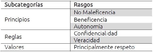 El procedimiento de análisis consistió en capturar3 de forma escrita todo lo expresado por los sujetos de la investigación y clasificarlo por temas recurrentes y significativos. Como ya se mencionó, se tomaron en cuenta los aspectos del marco teórico; con base en todas las categorías se derivaron subcategorías y rasgos, para dicha construcción se tomó en cuenta la propuesta de Coffey y Atkinson (2003), que consistió en identificar temas y patrones clave, condensando el grueso de los datos en unidades analizables para crear con ellos (o a partir de ellos) las categorías. Todas las respuestas se integraron en tres grandes rubros: Principios, reglas y valores; Factores de protección y Profesionalismo.