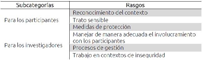 En las categorías que se construyeron con respecto a los factores de protección se pudo hacer una diferencia entre las medidas de protección para los sujetos de la investigación y para los investigadores. La mayoría de los trabajos sobre la ética de la investigación tiende a favorecer la protección de los participantes y, sin embargo, es igualmente importante considerar la de los investigadores.