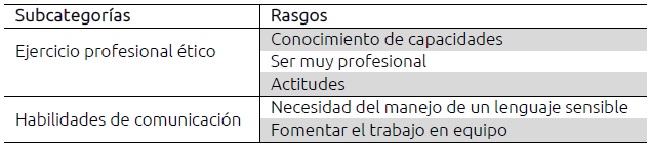 La segunda subcategoría se refiere a las habilidades de comunicación. En México se manifestó la necesidad del manejo de un vocabulario accesible y de fomentar el trabajo en equipo; mientras que en Bolivia se hizo mención de la comunicación en general, así como del trabajo comunitario y el carácter de complementariedad.