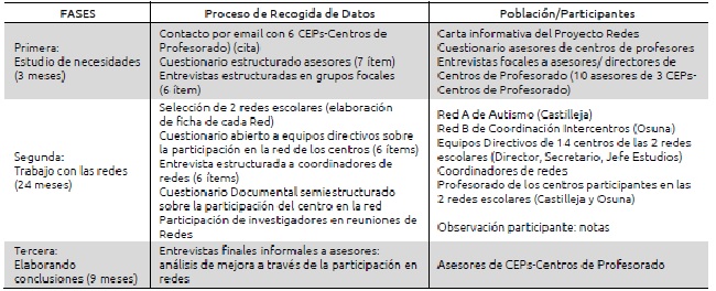 La metodología utilizada fue de corte participativo y colaborativo, interactuando y contactando continuamente con las redes en reuniones individuales y de grupo (entrevistas focales o focus group y entrevistas individuales). Respecto a los participantes/informantes de las dos redes estudiadas, éstos han sido asesores de Centros de Profesorado, profesorado de los centros, equipos directivos, orientadores de centros y coordinadores de Grupos de Trabajo, así como inspectores de zona. El proceso de recogida de datos y las fases estructuraron de la siguiente forma: