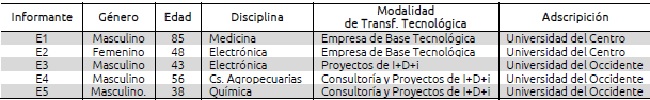 Para el seguimiento de entrevistados se utilizó la técnica de bola de nieve (Taylor y Bogdan, 1987). Los profesores investigadores que realizan transferencia tienen una red informal de colaboración científica conformada por otros profesores-investigadores que realizan prácticas similares. Se contactó a investigadores de dos universidades públicas estatales ubicadas en el centro y en el occidente de México que están afiliadas a diferentes disciplinas, que conforman dichas redes y que estuvieron dispuestos a participar en la investigación. El número de participantes en el estudio obedece al principio de saturación teórica, lo que permitió definir cualidades específicas de transferencia de conocimientos en una población de universidad pública (Strauss y Corbin, 2002). En la investigación participaron diez profesores-investigadores, pero para efectos del presente artículo se describen y analizan cinco casos.
