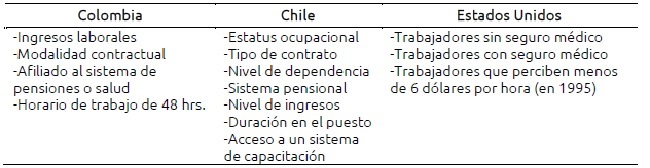 Recuperando los trabajos sobre calidad de empleo y condiciones laborales, Granados y Vences (2011) realizan una concentración de las variables que utilizan los estudios de Colombia, Chile y Estados Unidos (tabla I).