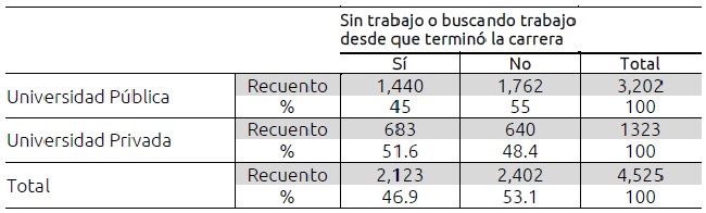 En cuanto a la asociación entre las variables de tipo de institución y el ritmo de incorporación al mercado laboral, se observa que 51.6% de los egresados de universidad privada han estado sin trabajo y en busca del mismo desde que terminaron la carrera. En contraste, 45% de los graduados de universidad pública han estado sin trabajo o buscando uno desde que terminaron la carrera (ver tabla II). En este sentido, los egresados de universidades privadas tienen un menor ritmo de incorporación al mercado laboral.