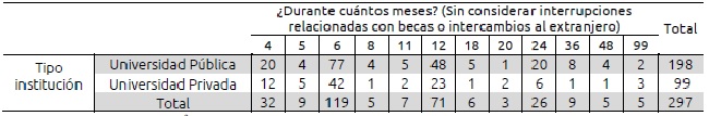 Al cuestionar cuánto tiempo han estado sin trabajo (en términos de meses) cabe destacar que la mayoría de egresados de ambos sectores estuvo sin trabajo 6 meses. En la universidad pública 77 egresados reportan haber estado sin trabajo durante 6 meses. Asimismo, la mayoría de egresados de privada (42) reporta la misma situación (ver tabla III). No obstante, los resultados de la prueba x2 indican que no existe una diferencia significativa al diferenciar por tipo de institución.