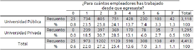 Esto podría explicar el hecho de que las condiciones laborales de los egresados de instituciones privadas son mejores, ya que tienen mayor estabilidad laboral (vista desde el tipo de contrato), pues desde la perspectiva de Salas (2013), la estabilidad en el empleo es parte de un trabajo de calidad. Lo anterior se confirma cuando se observa el número de empleadores, ya que la mayoría de los egresados de instituciones privadas han tenido dos empleadores.