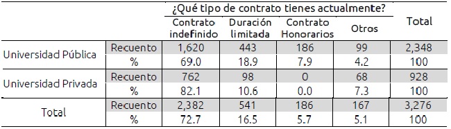 Con relación al tipo de contrato por tipo de institución se contempla el contrato indefinido, de duración limitada, contrato de honorarios y otros. Esta última categoría integra los tipos de contrato de tres meses, a prueba, negocio propio, por proyecto, etc.