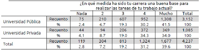 Con relación a la coincidencia entre ocupación y formación (desde la percepción de los egresados), la respuesta a la pregunta: ¿En qué medida ha sido tu carrera una buena base para realizar las tareas de tu trabajo actual? se muestra en una escala de Likert, donde 5 es “mucho” y 1 es “nada”. En la tabla VII podemos observar que existe un mayor grado de coincidencia para los egresados de pública, ya que el 41.5% mencionó que la formación es una buena base (“Mucho” o 5) para su trabajo actual, en comparación con el 34% de los egresados de la privada.