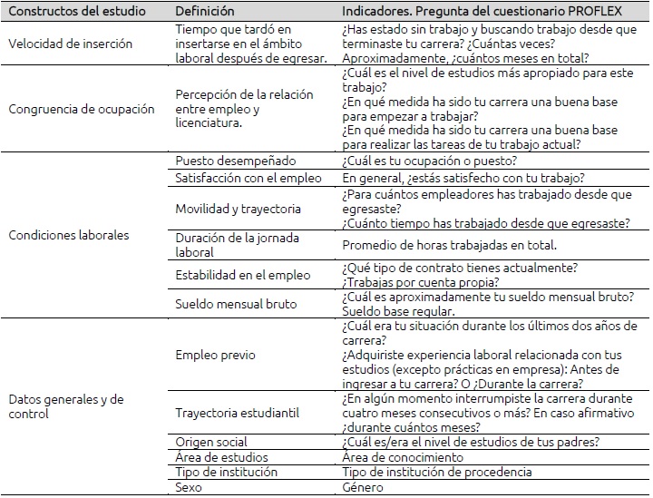 Se consideraron aquellas preguntas que se relacionaban con el empleo previo, la trayectoria estudiantil, el origen social, el área de estudios, el tipo de institución y sexo las cuales se consideraron como variables de datos generales y de control. También se tomó para medir la rapidez de la inserción laboral el tiempo que tardo en insertarse en el ámbito laboral después de egresar.