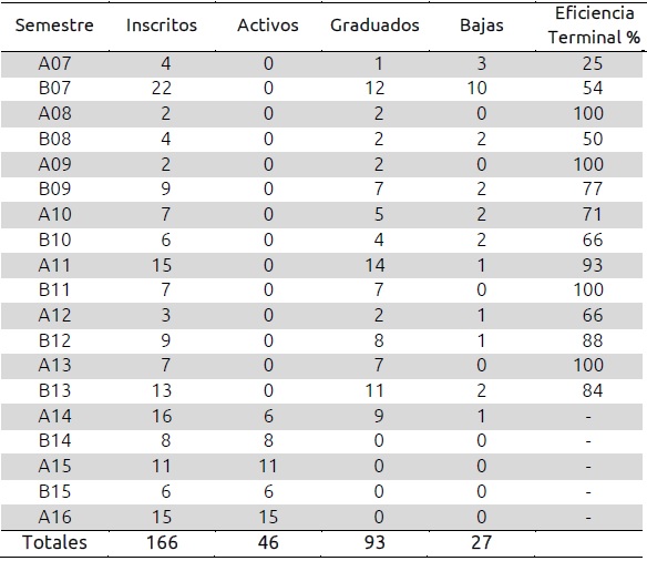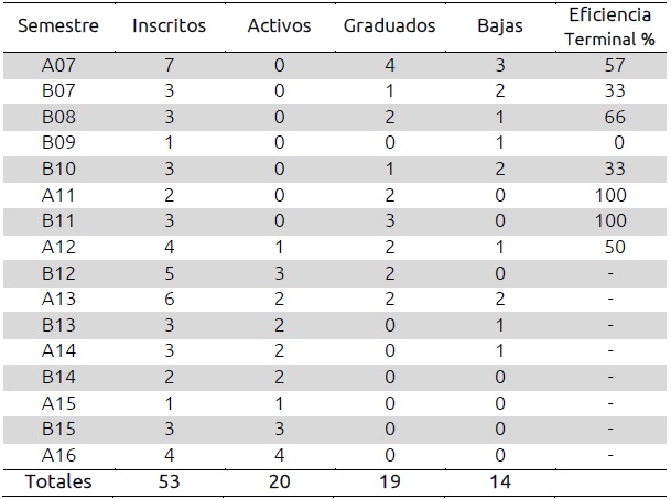 En el programa del DTA se contabilizaron 53 alumnos inscritos de enero 2007 a enero 2016. De los cuales 20 continúan activos, 14 causaron baja y 19 se graduaron. Es necesario mencionar que en los semestres A08, A09 y A10 no hubo alumnos inscritos en este programa. Referente a la eficiencia terminal, en los semestres B07, B09, B10 y B12 está por debajo del 50%, y en los demás está por encima de este porcentaje; la tabla II muestran estas estadísticas.